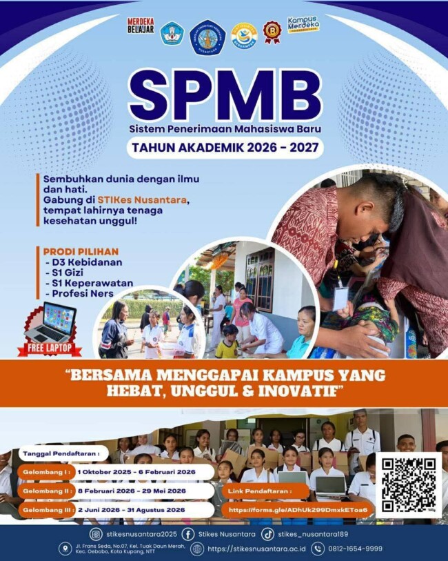 (Kupang-Menitnusantara.com) Sekolah Tinggi Ilmu Kesehatan (Stikes Nusantara Kupang Buka SPMB Tahun Akademik 2026/2027, Stikes Nusantara Kupang Buka SPMB Tahun Akademik 2026/2027, Stikes) Nusantara Kupang kembali membuka Seleksi Penerimaan Mahasiswa Baru (SPMB) untuk Tahun Akademik 2026/2027. Kampus ini menawarkan empat program studi yang seluruhnya telah terakreditasi, dengan salah satu unggulan yakni S1 Ilmu Gizi yang meraih predikat “baik sekali”.